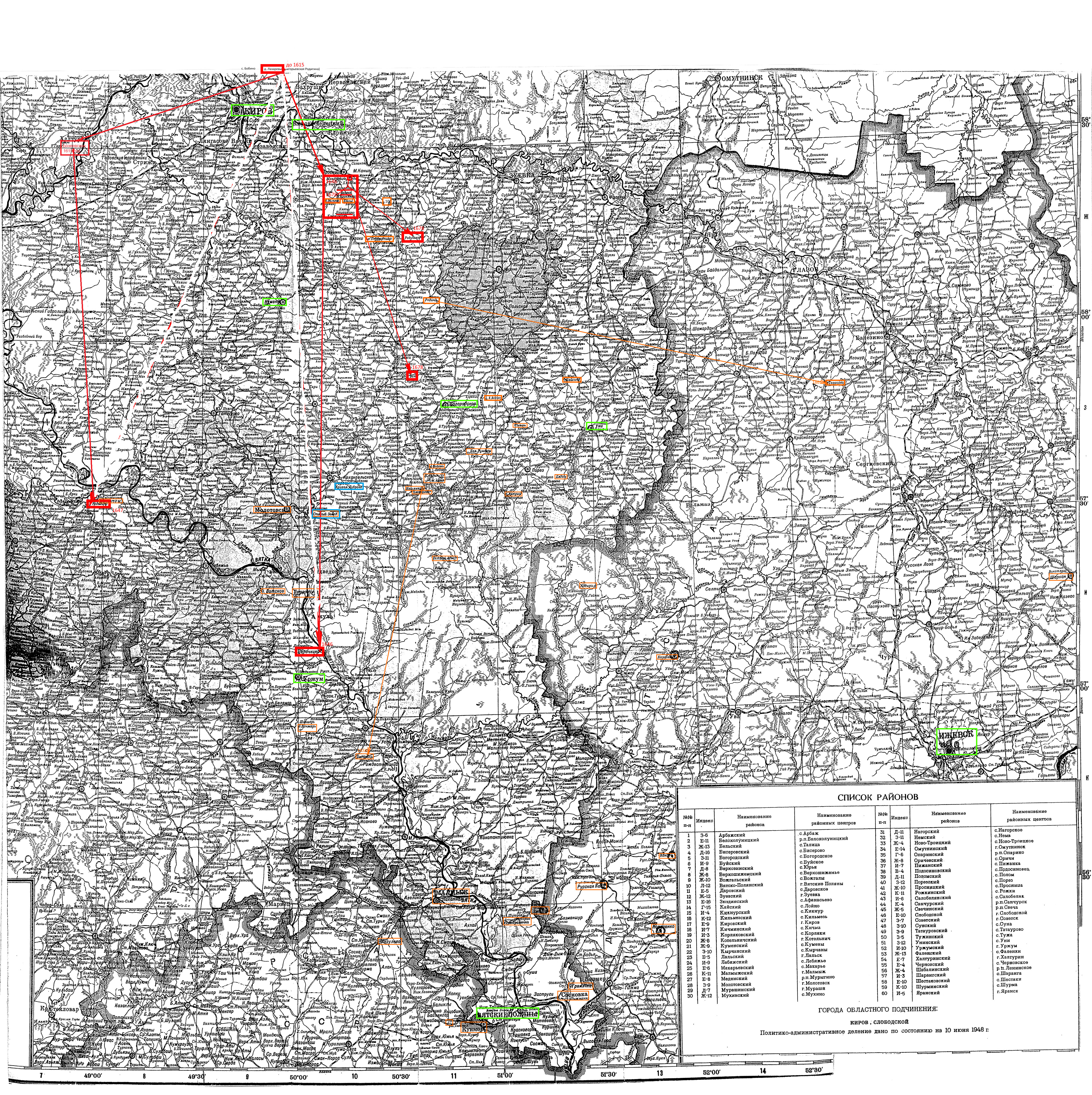 Карта Кировской области 1948 года с населенными пунктами (в которых Родыгины проживали компактно).